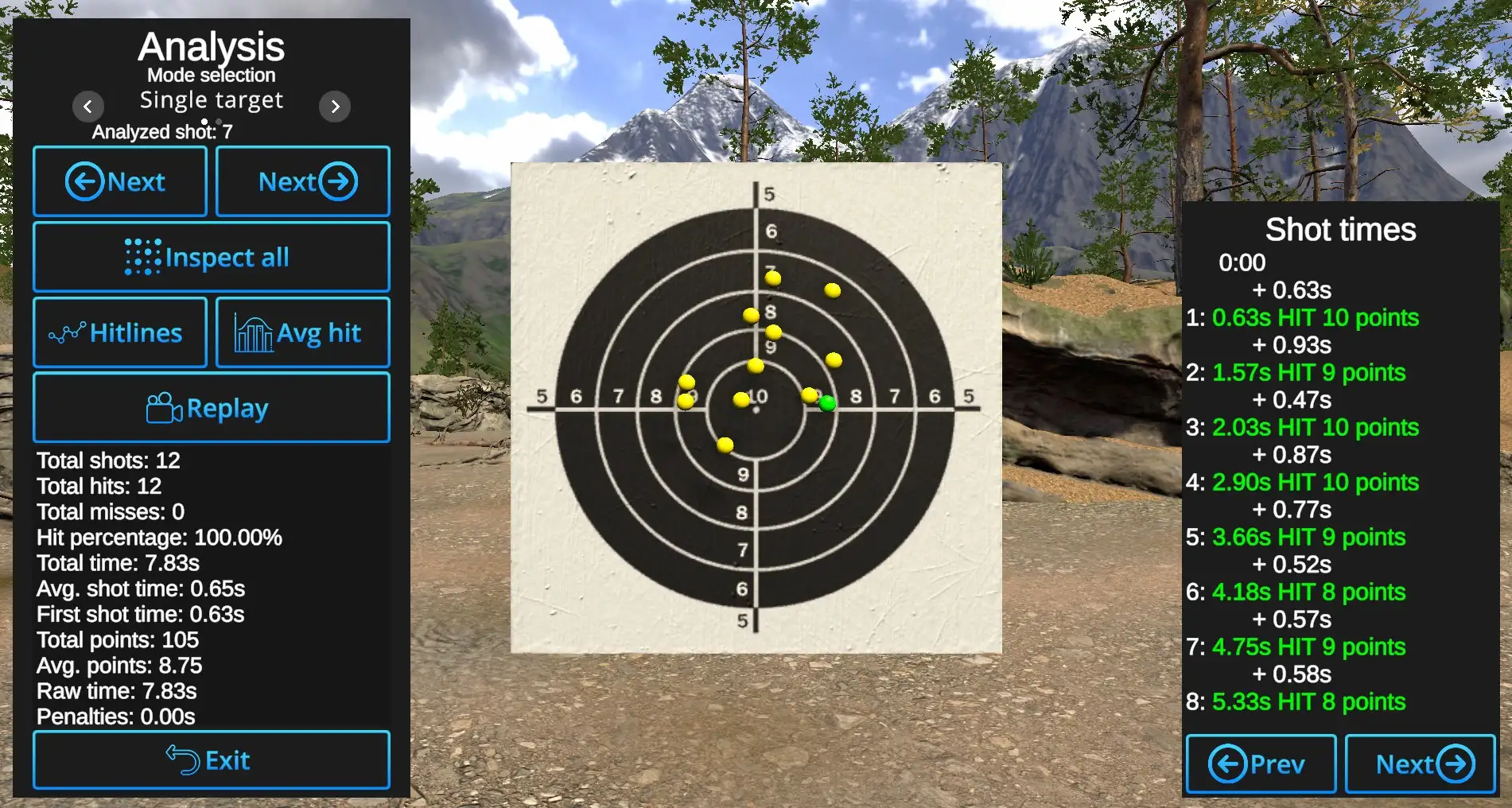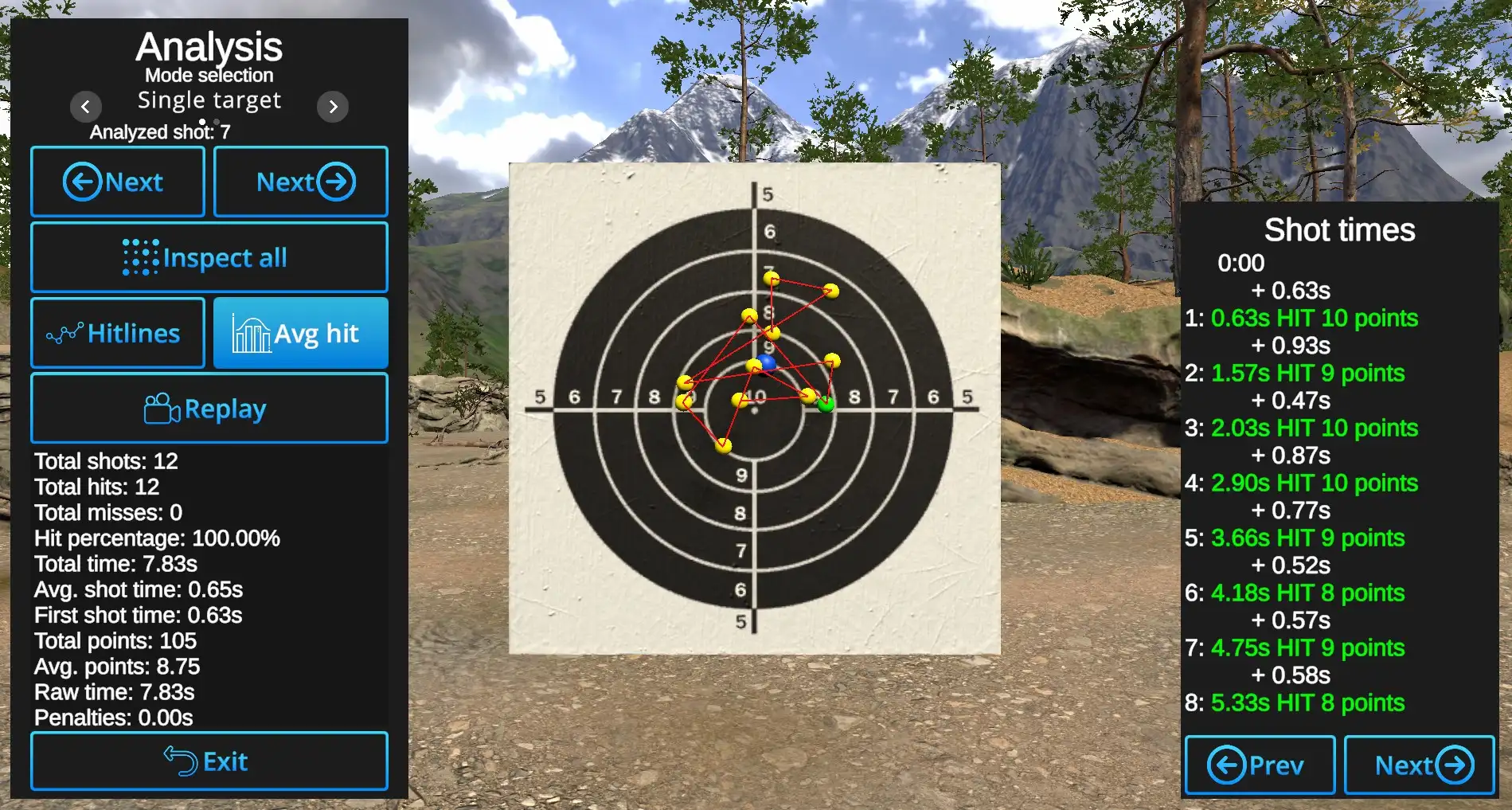 Shot-by-Shot inspection: Arrows with 'Next' show the hits one by one. Currently reviewed shot will be shown in Primary hit color.