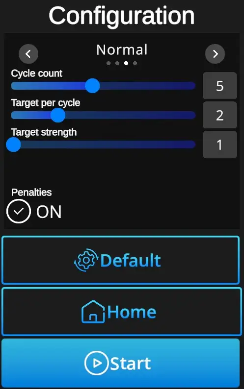 Target strength: Indicates number of hits necessary to remove each target. Standard setting is 1, custom setting allows up to 5 hits per target.