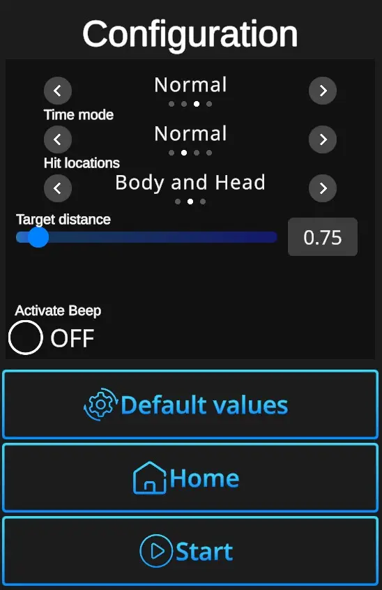 Default values: In one click resets the scene to default setting - Difficulty Normal + Time Mode Normal + Hit locations Body and Head + Target distance at 0,75 + Activate Beep OFF.