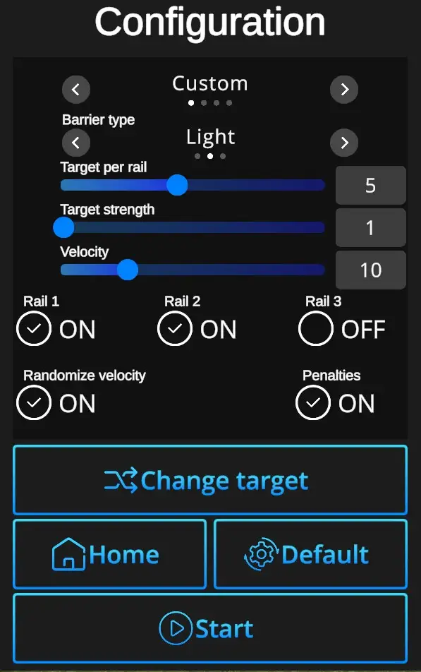 Default: In one click resets the scene to default Rail Targets setting - Normal Difficulty + Light Target + Target per Rail 5 + Target Strength 1 + Velocity 5 +Rail 1 ON, Rail 2 ON, Rail 3 OFF, Randomized Velocity ON + Penalties ON.